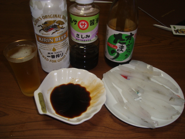 夜中は寒いので車内で鍋でビールと日本酒をちびちびと・・・そして朝一一投目の2シャクリ目にこいつをゲットアオリイカは最高にうまいぜよ神奈川の弟者に送ってやるかなwどうかな?